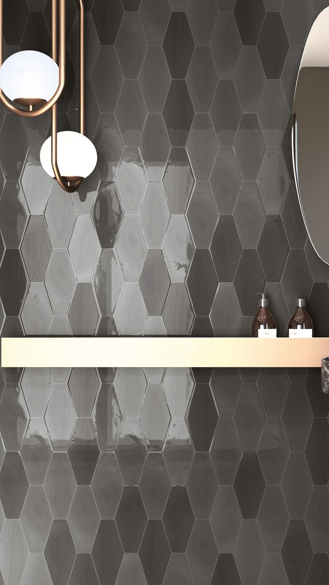 Our Jester glossy wall tiles feature a flattened hexagonal design, great for creating a more dynamic look on walls.