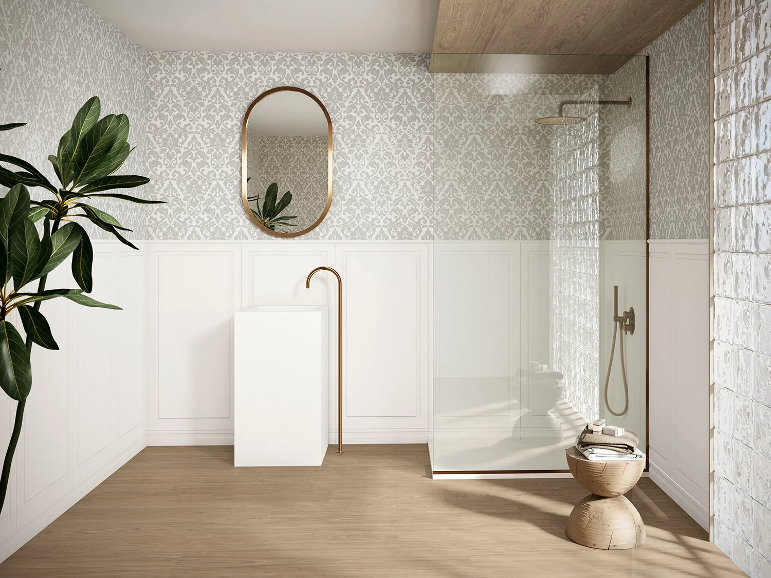 Looking for an alternative to wallpaper? Take a look at our new Grigio ceramic tiles. These tiles feature popular embossed damasks and floral trails in neutral shades.