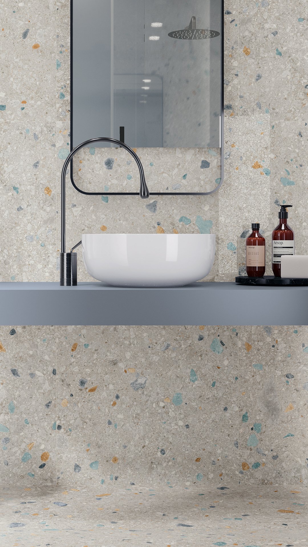These large chip, terrazzo style tiles offer a robust yet stylish flooring choice. The playful design is inspired by Italian stone giving you a distinctive, on-trend look.