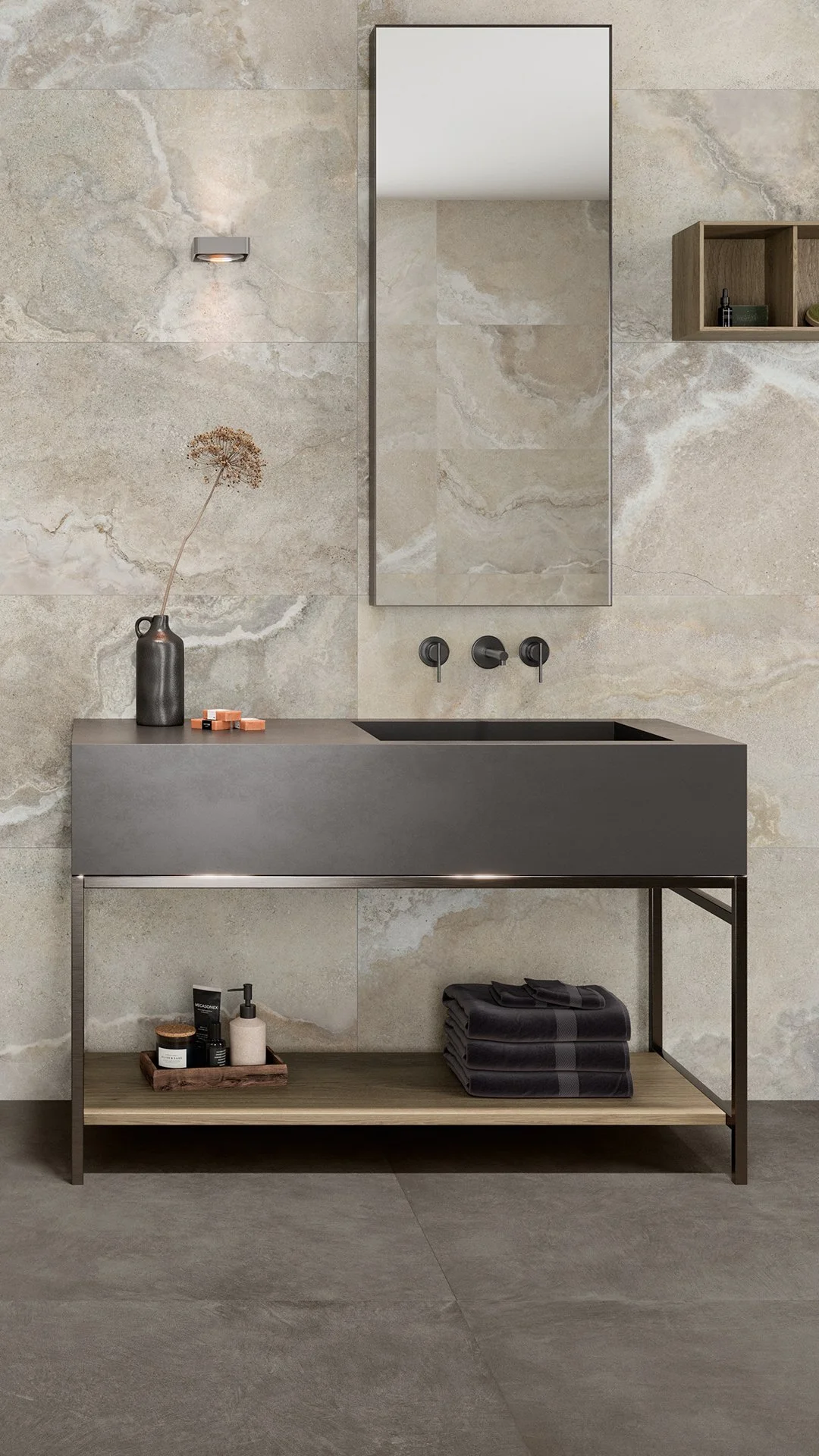 Looking for interior design ideas? Use neutral colours for a modern, sophisticated look. Choose Onyx style marble effect tiles for a luxury finish.