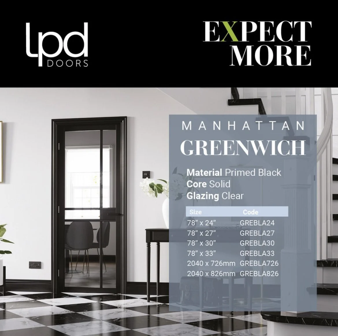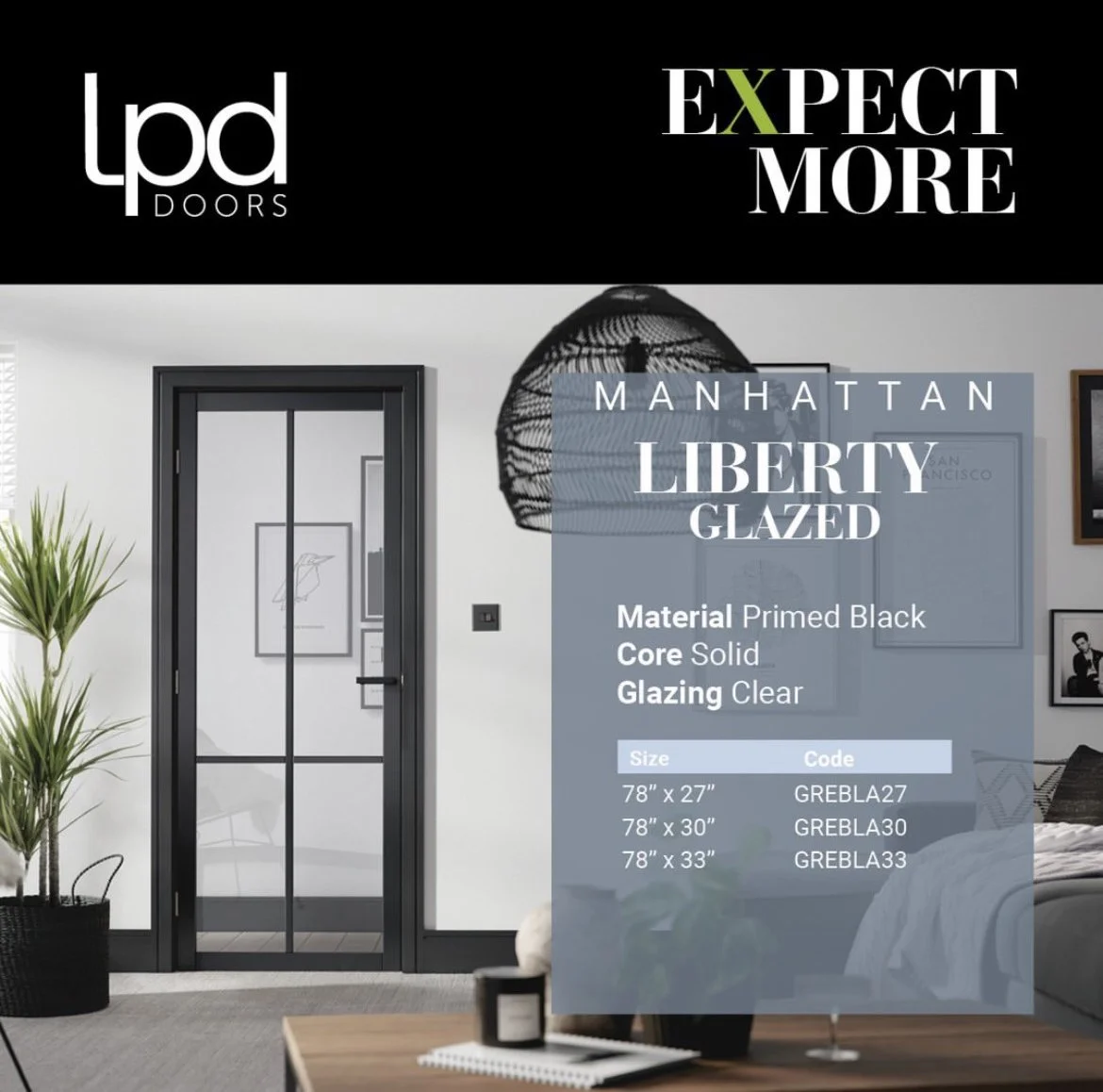 The industrial style Tribeca clear glazed door is now on display in our Liverpool showroom. The sleek, modern Tribecas feature on trend black beading and generous glazed panels. Also available as a solid door. Matching door hardware is also on display alongside an extended range of interior Oak, White and Coloured doors from LPD Doors.