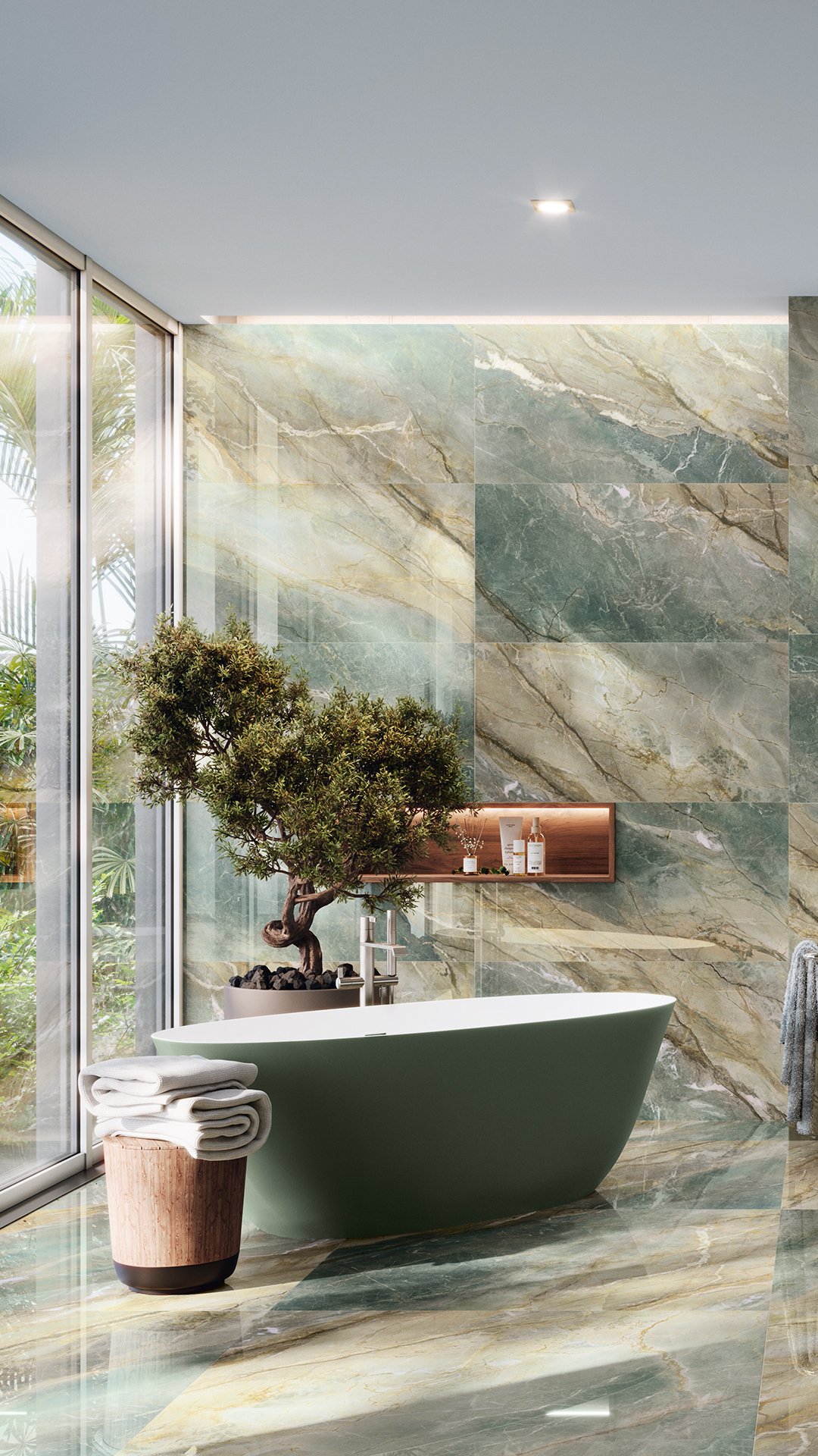 The Brazil Green tiles are another stuning range in the XLINING large format collection by Ape Grupo. The complex veining gives these tiles a unique, subtle glow.