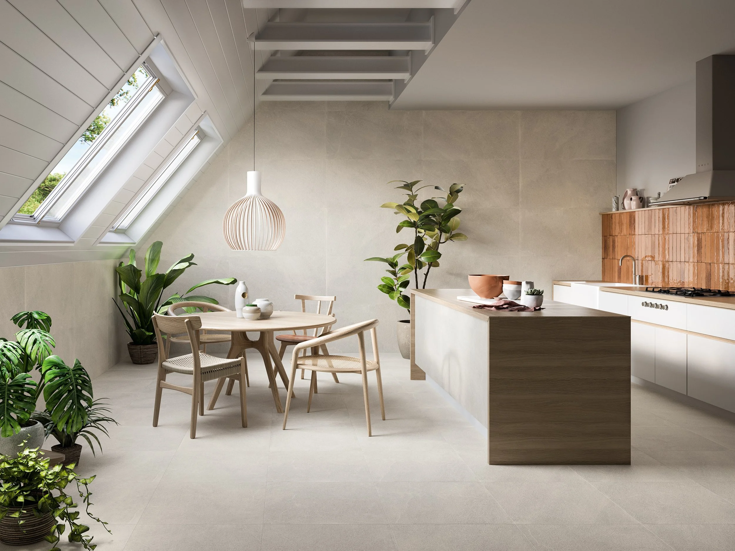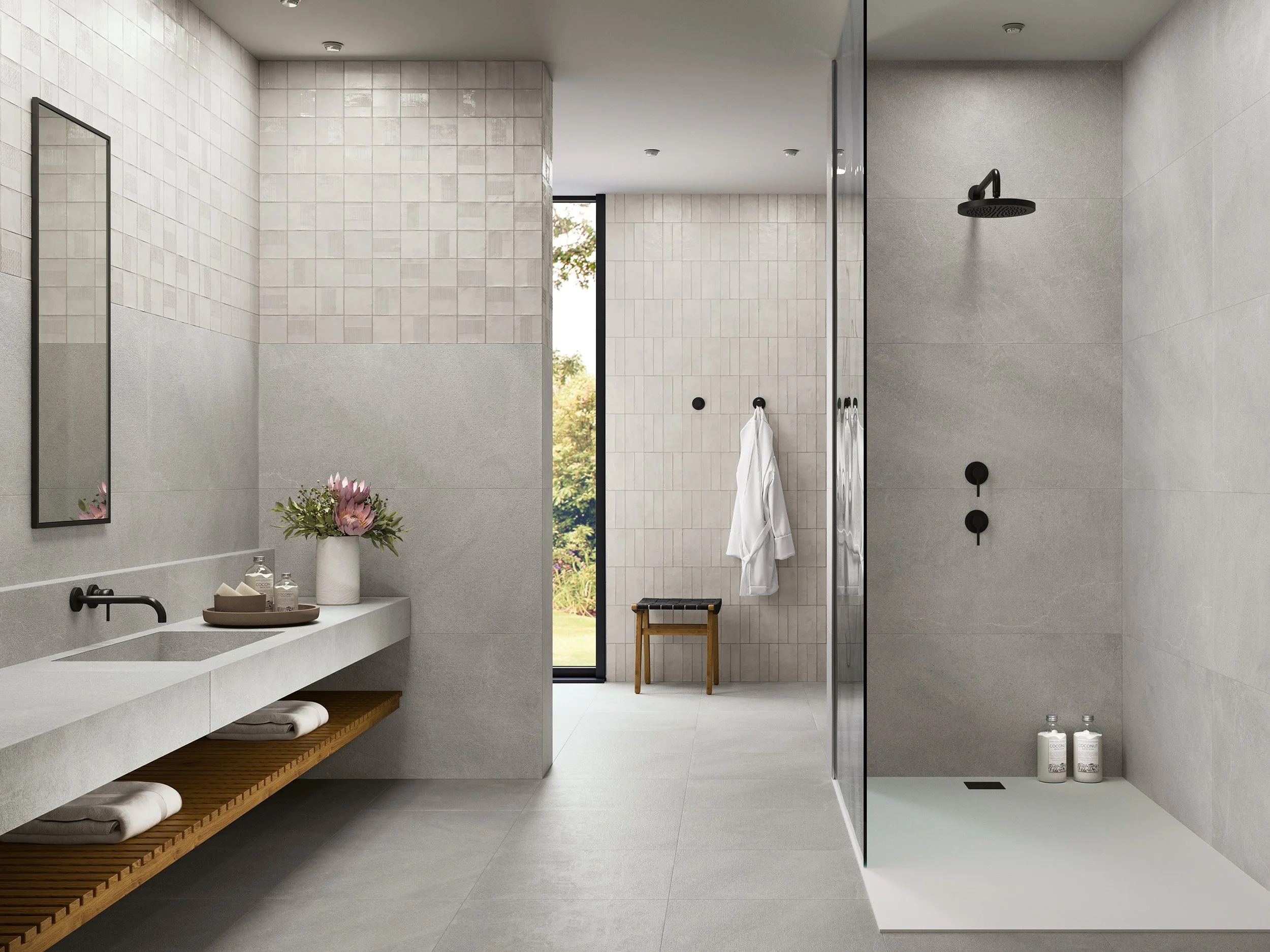 These decorative ceramic tiles draw their inspiration from the rugged Cumbrian mountains of the UK. Shown here are the Burlington Cumbrian ceramic tiles, which can be paired with the matching weathered stone-look plains from the same collection to create these on-trend looks.