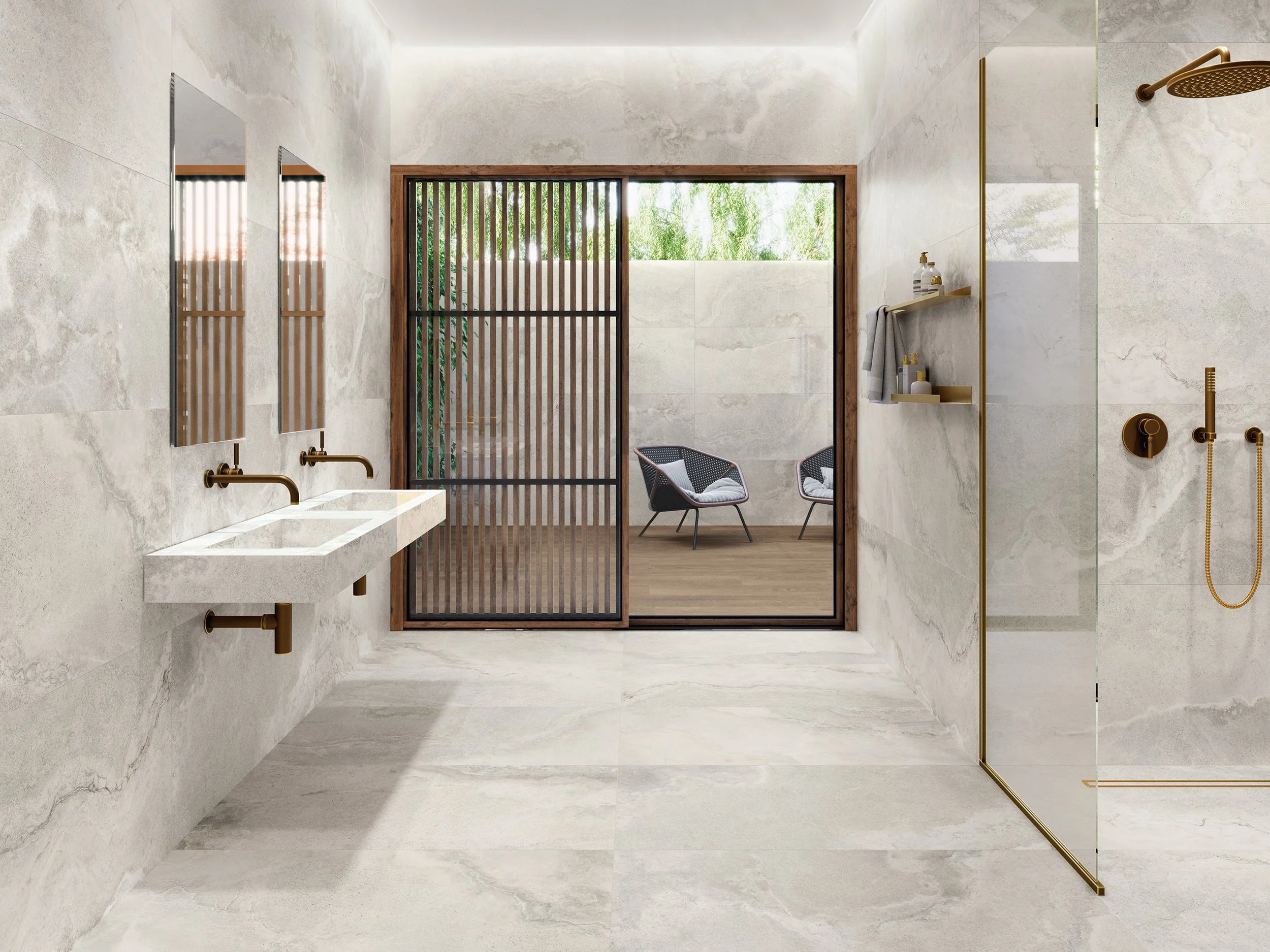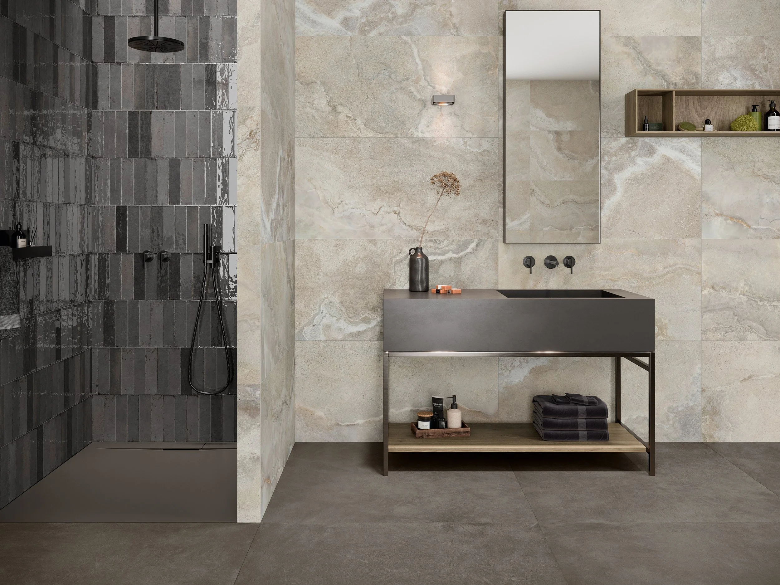 The Cross porcelain stone-effect tiles draw their inspiration from rich Burgundy stone and elegant Onyx marble. Subtle, intricate veining runs through each tile, giving the surface an engaging sense of natural movement and refined character. Choose from white, sand and taupe colours.